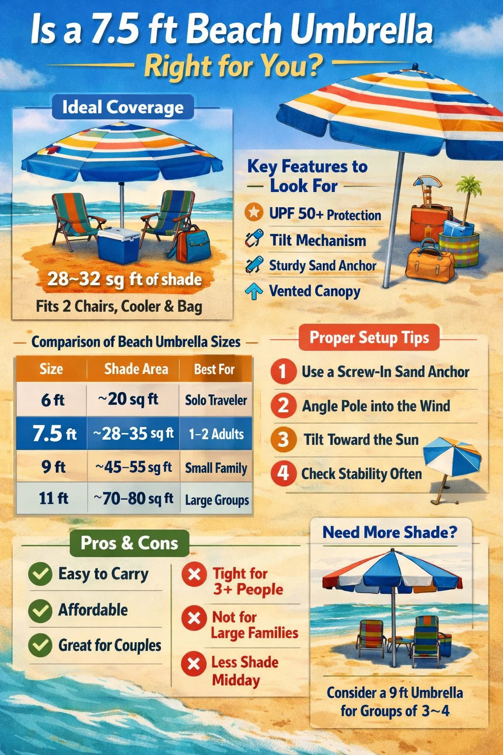 Det korte svaret: en 7,5 fots strandparasoll er den mest populære størrelsen på markedet med god grunn — den dekker omtrent 28 til 32 kvadratmeter med skyggelagt område, som er nok til to strandstoler, en kjøler og en bag uten at noen sitter i direkte sollys. Hvis du handler alene eller for et par, treffer en baldakin på 7,5 fot det beste mellom portabilitet og praktisk dekning. For grupper på tre eller flere kan det være lurt å se på alternativer på 9 fot, men for de fleste strandturer er 7,5 fot det beste.