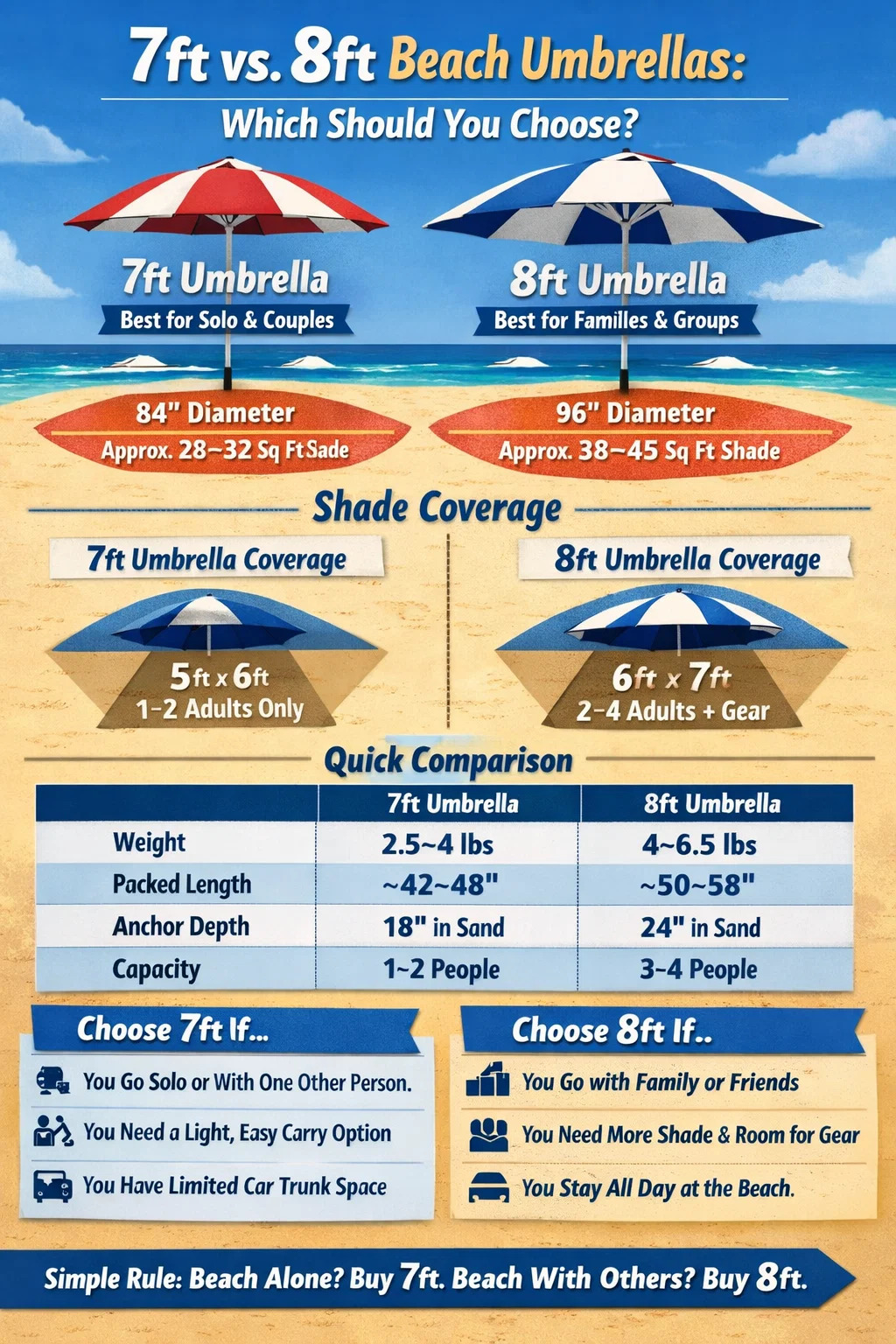 Hvis du kjøper en strandparasoll og lurer på om 7 fot eller 8 fot er det bedre valget, her er det direkte svaret: en 8 fots strandparasoll er bedre for grupper på 3 eller flere personer, mens en 7 fots paraply er et smartere valg for enkeltpersoner eller par som prioriterer portabilitet. Forskjellen i baldakindiameter mellom disse to størrelsene oversettes til et meningsfylt gap i brukbar nyanse - og det gapet betyr noe når du prøver å holde hele familien kjølig på en varm sommerettermiddag.
