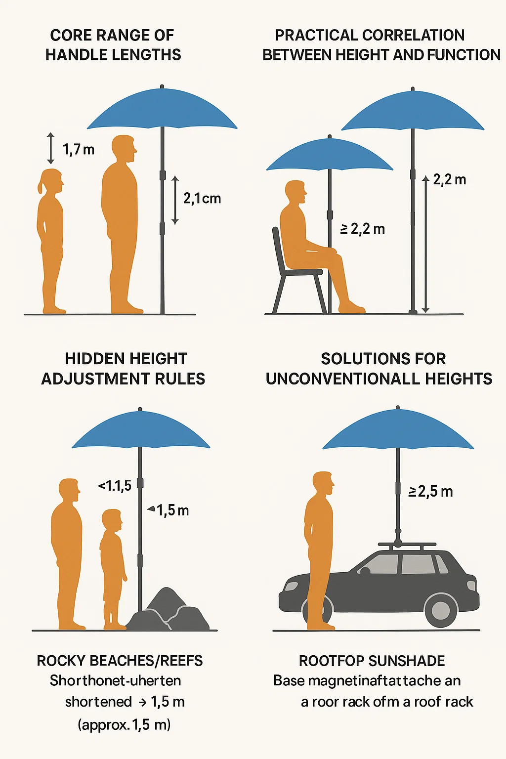 Korte paraplyer (≤1,8 meter): Designet for solbeskyttelse mens du sitter. Randhøyden samsvarer med ryggstøtten til en strandstol (70-80 cm), og sikrer at hodet blir utsatt for solen når du står.