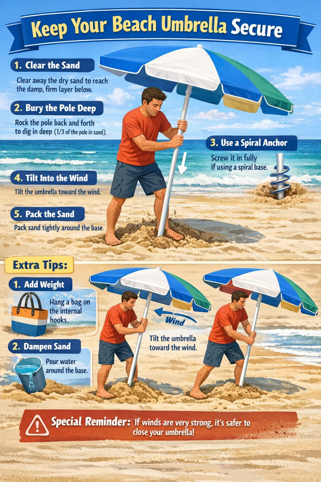 For å sikre din strandparasoll forblir stabil i havbrisen og blåses ikke bort, noen få installasjonstriks er avgjørende. Å følge disse trinnene vil redusere risikoen for at paraplyen din blir båret bort av vinden betydelig: