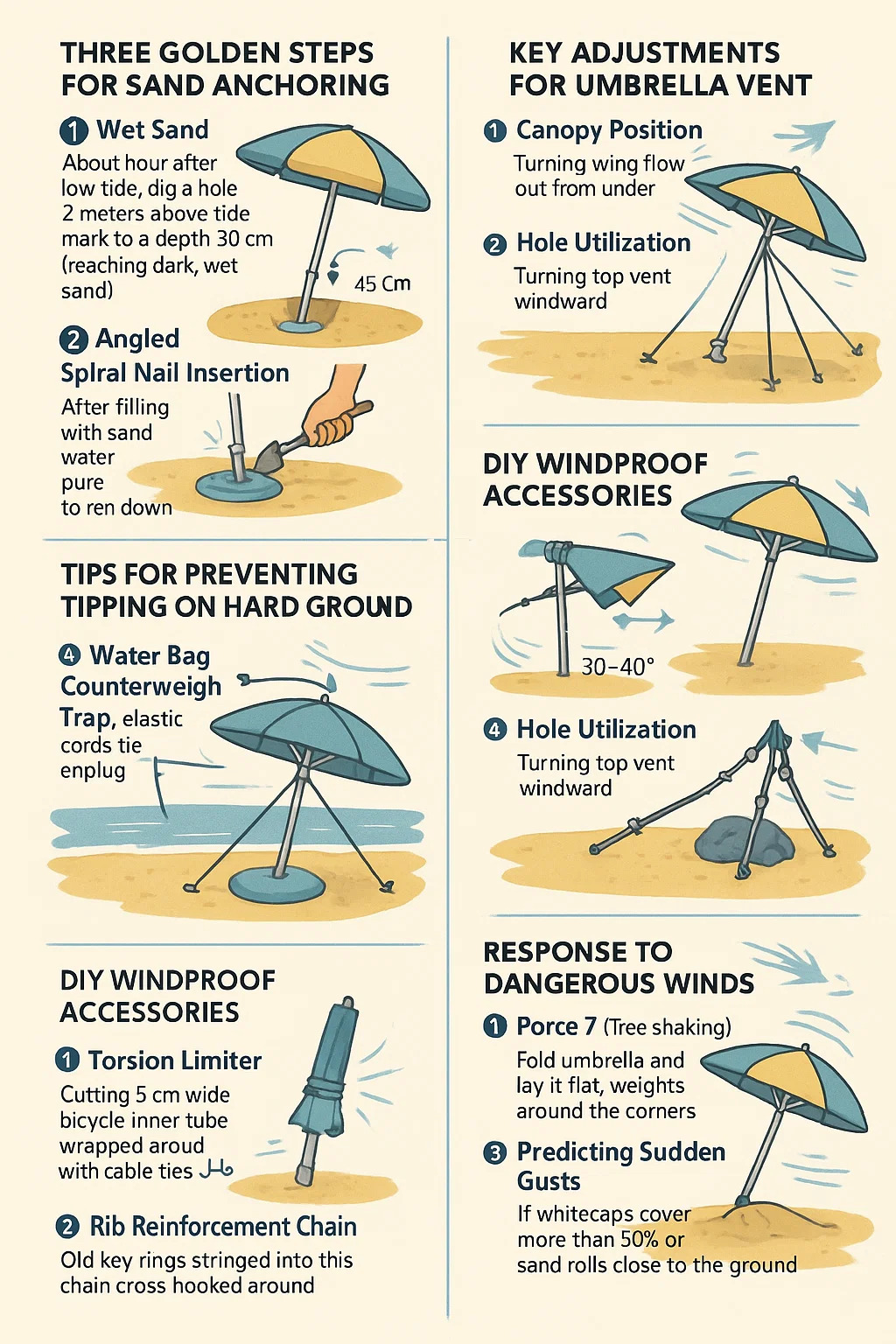 Følgende er praktiske installasjonstips for å sikre en Beach -paraply er stabil og vindtett: