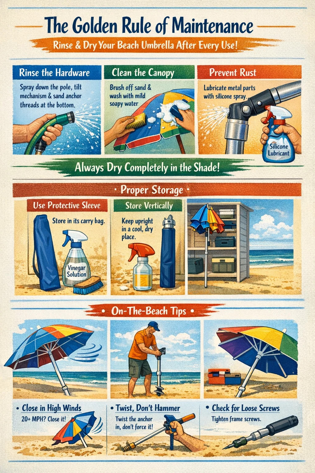 Det mest kritiske trinnet for å opprettholde en strandparasoll er å skyll den med ferskvann og tørk den helt etter hver eneste bruk. Saltvann og sand virker som etsende midler som bryter ned stoff og rustmetallfuger. Ved å bruke fem minutter på å skylle utstyret ditt, kan du forlenge levetiden fra en enkelt sesong til over fem års pålitelig bruk .