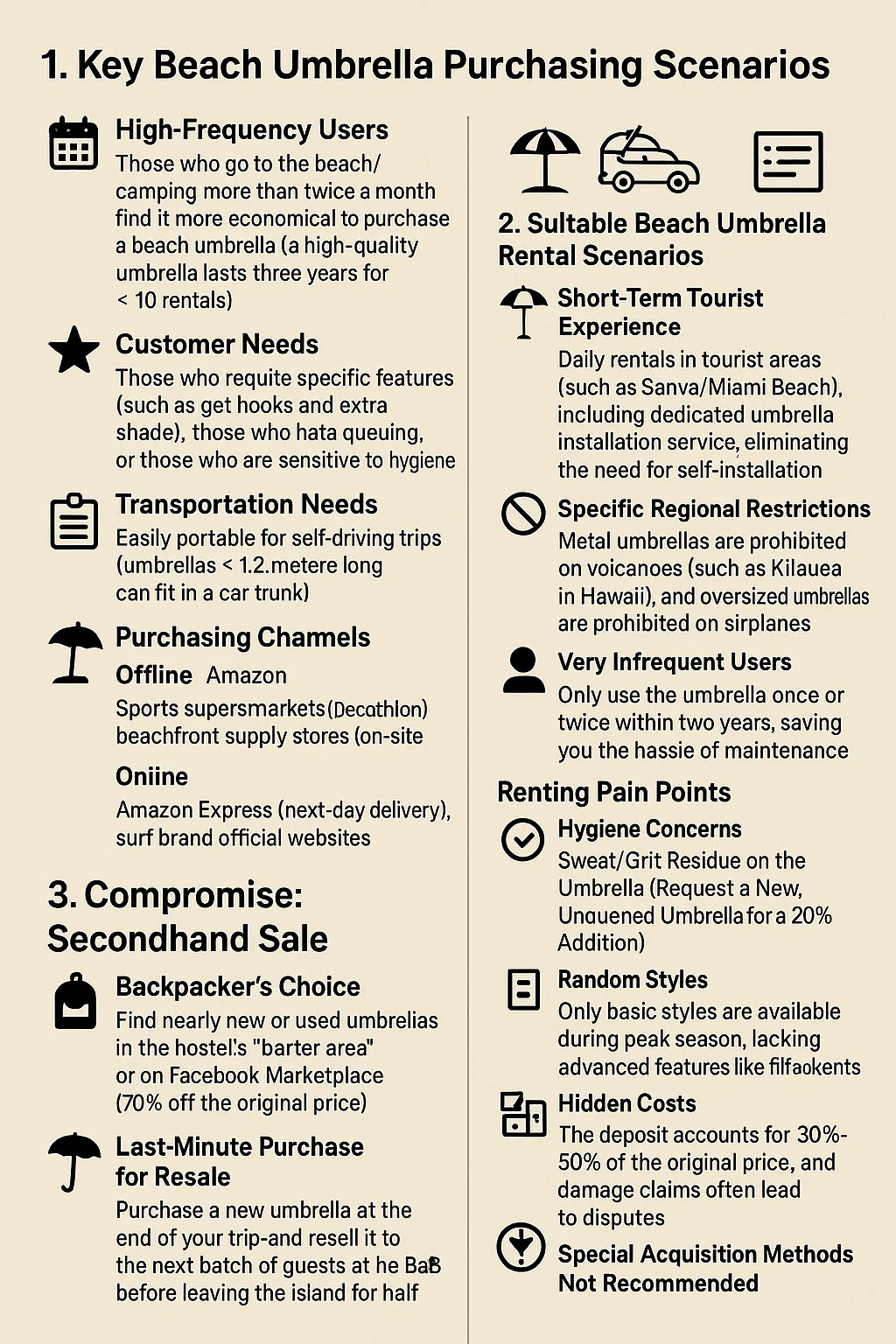 Kortsiktig turistopplevelse: Daglig utleie i turistområder (som Sanya/Miami Beach), inkludert dedikert paraplyinstallasjonstjeneste, eliminerer behovet for selvinstallasjon.