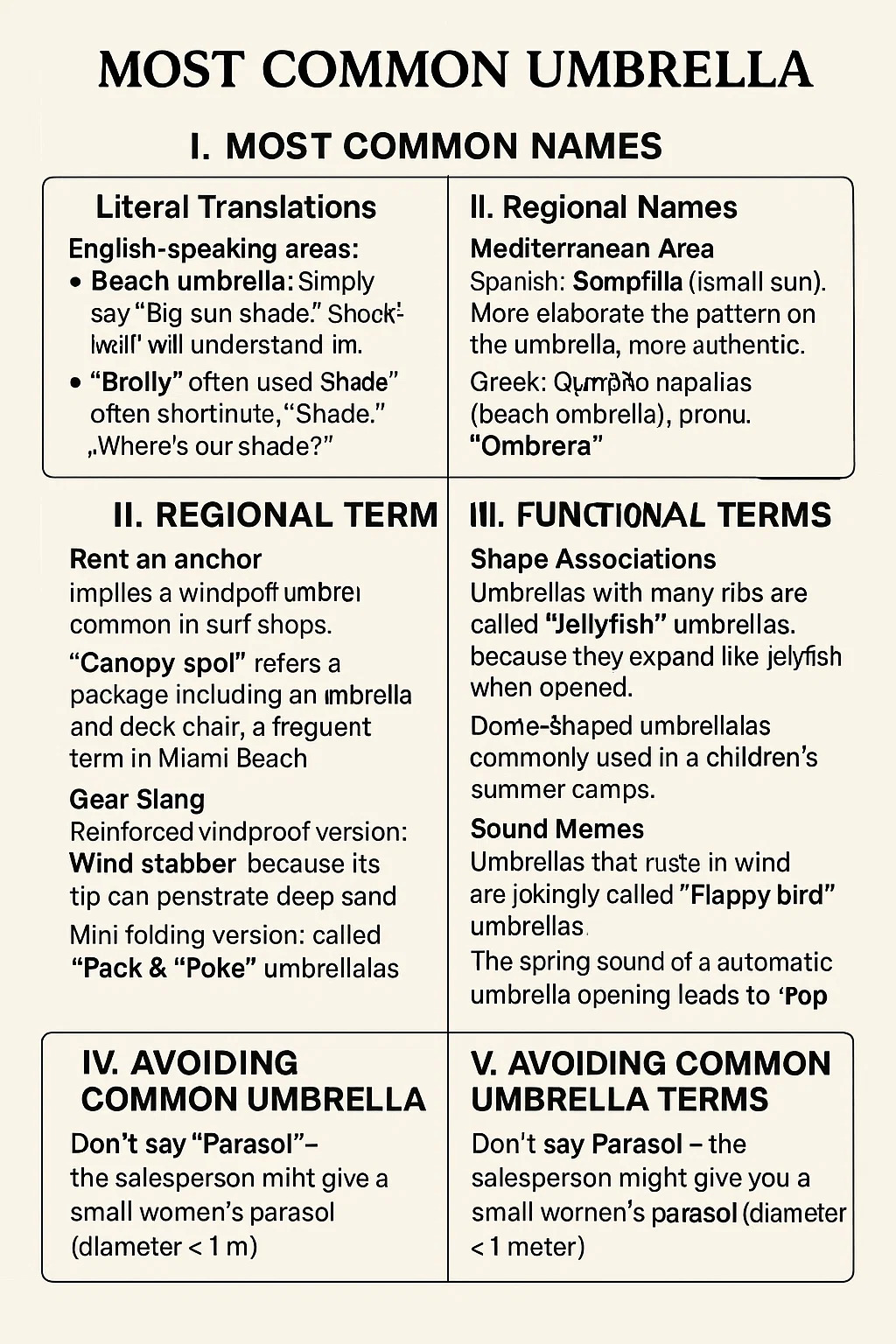 Her er vanlige navn for strandparasoller i ulike sammenhenger: