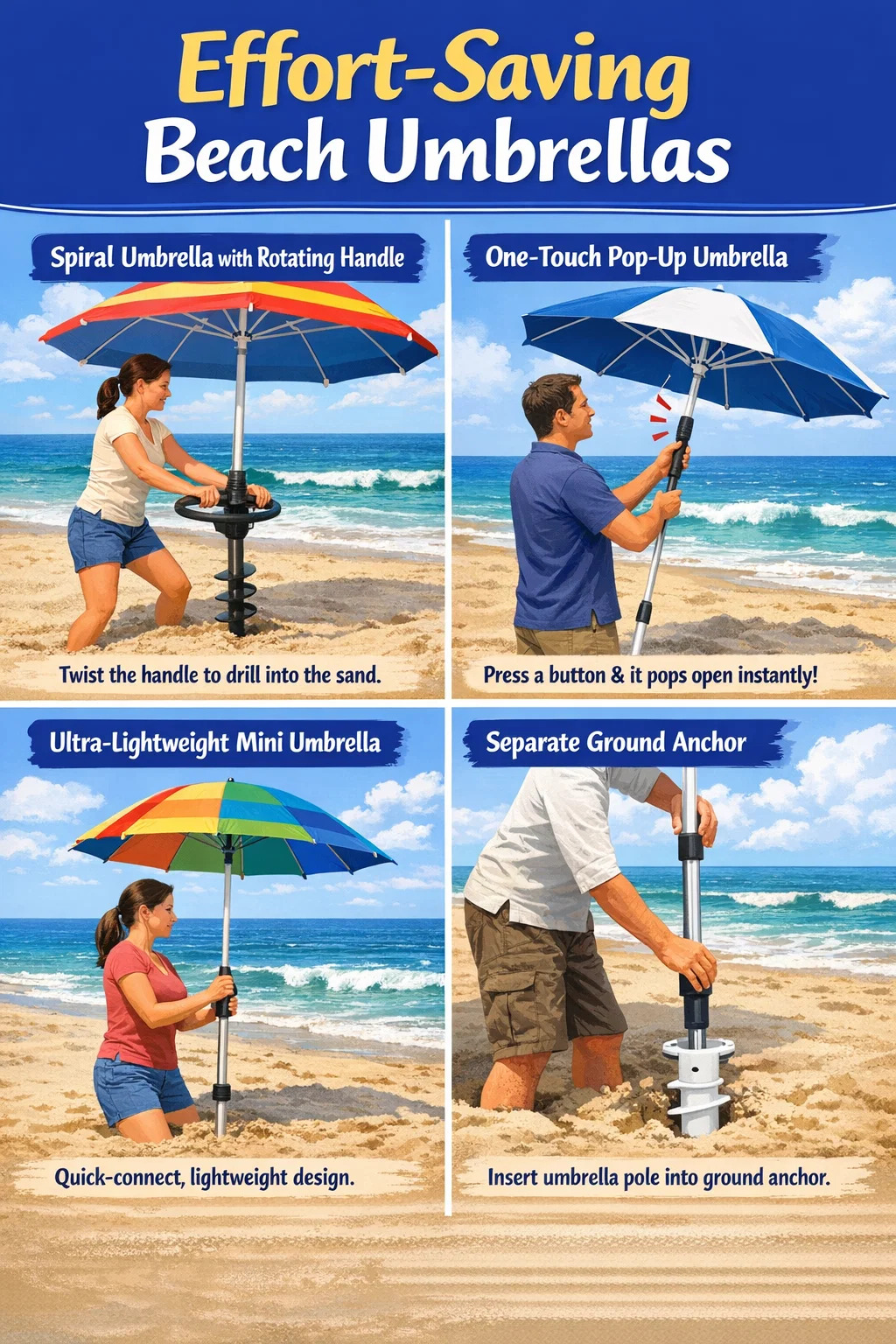 Hvis du leter etter en strandparaply som ikke krever en herkulisk innsats for å sette opp, så er "one-touch" eller "innsatsbesparende" design definitivt det beste valget.
