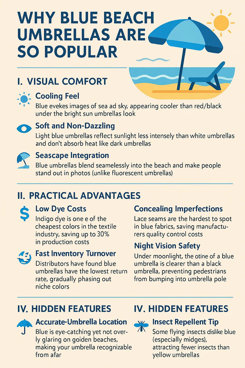 * **Seascape Integration:** Blå paraplyer smelter sømløst inn i stranden og får folk til å skille seg ut på bilder (i motsetning til fluorescerende paraplyer).